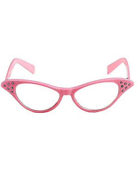- The pink ’50s rhinestone trimmed glasses are made of plastic