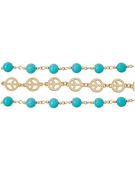 Layer this set of three bracelets for a ’60s look that’s all about peace and love! Featuring one peace sign bracelet and two beaded teal bracelets, these accessories will complete your mod style in a snap.