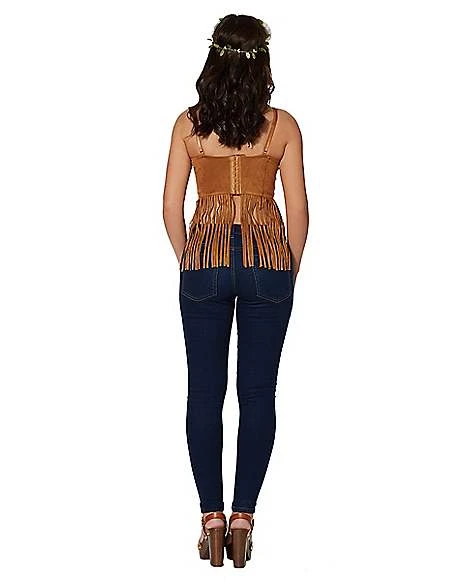 Rock a throwback look with this brown suede top! Featuring fringe along the bottom, this top is perfect for any vintage, western, or hippie costume!