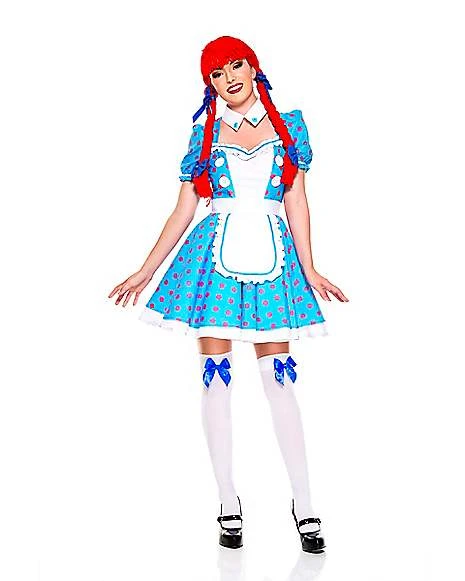 Dress a little more fun and flirty this year with this racy rag doll costume. This cute, short dress is light blue with red polka dots and white accents, and features a low neckline, making it perfect for showing everyone how much of a doll you are!