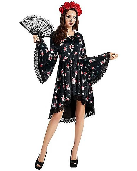 Celebrate your favorite holiday in style when you get all dressed up in this Adult Sugar Skull Darling Costume. You’ll look perfect for any Day of the Dead party wearing this outfit that features a black dress with skull pattern, red rose crown, and a handheld fan. You’ll love how authentic you look wearing this Day of the Dead costume.