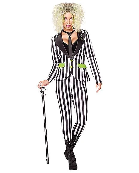Beetlejuice. Beetlejuice! BEETLEJUICE! Bring your favorite ghost to life when you wear this officially licensed Beetlejuice Suit Costume. This costume includes a jacket, pants, tie, and pins, giving you the wacky look that Beetlejuice fans will love!