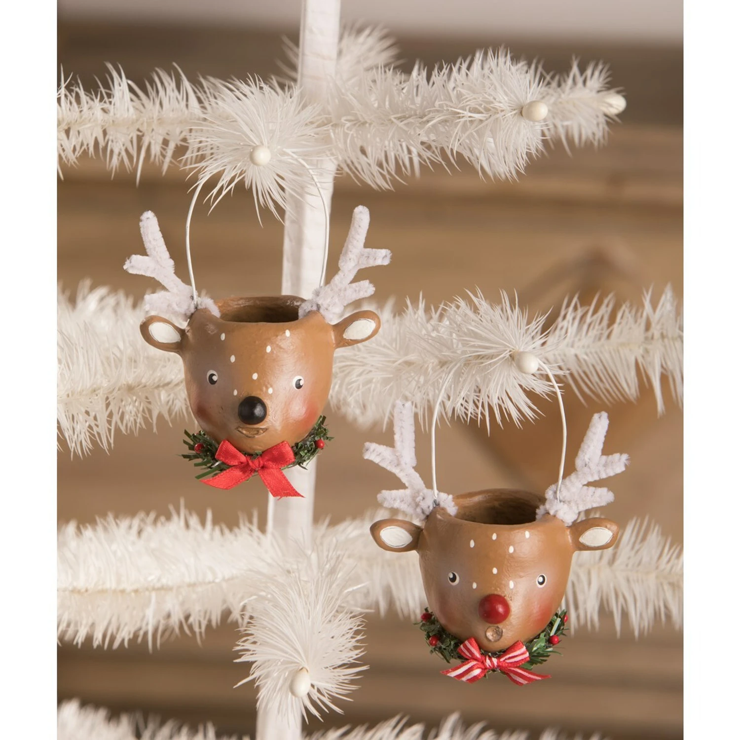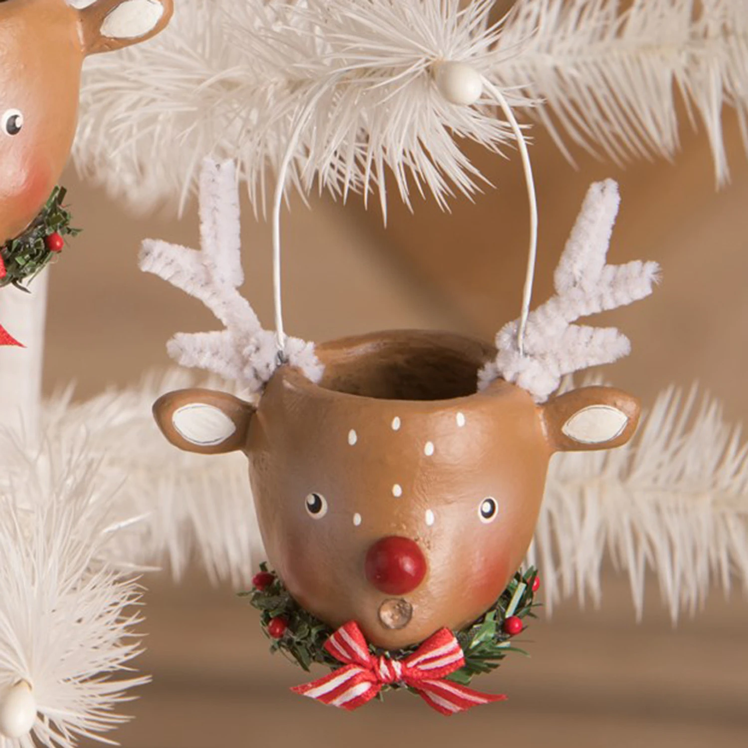 These cute little reindeer ornaments feature a bucket with a deer face dotted with white spots and a round nose. Around their neck is a sprig of greenery with red berries. At the top pipe cleaner antlers poke out with the basket handle. Perfect to hang in your Christmas tree or use on your table setting! Each sold individually. Made by Bethany Lowe. Made of resin, chenille, ribbon, and artificial greenery. Dimensions: 3″ X 3″ X 2″. Item #: ML0425