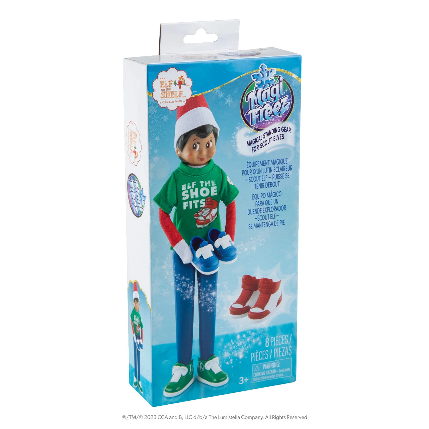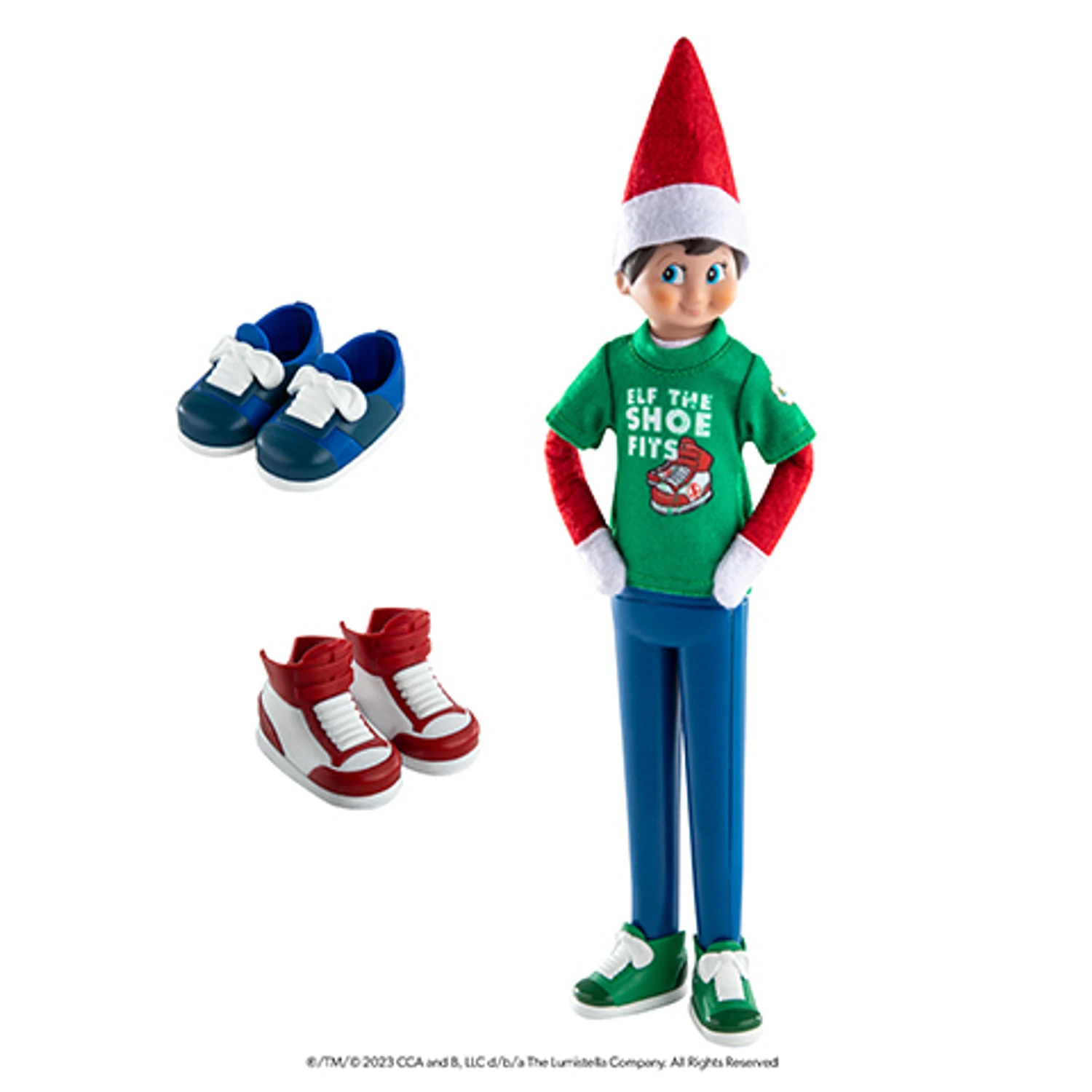 This outfit features a pair of jeans that help your Elf stand up straight, a green tee that has a punny “Elf the shoe fits!”, and three different pairs of sneakers to choose from! Item #: MFSNEAKERÂ