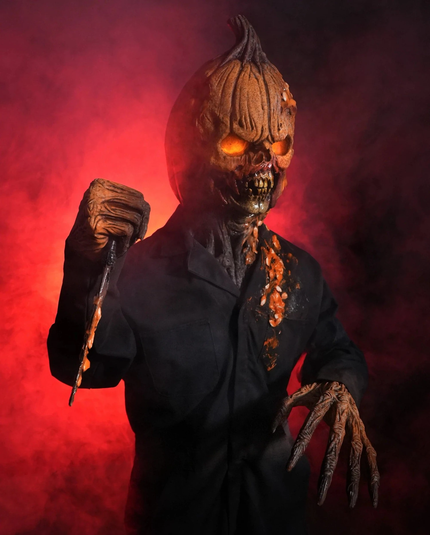 Standing over 6 feet tall, Jack Is Back is an ultra scary, life size, standing Halloween prop, new for the 2022 Halloween season. This pumpkin killer has been up to no good, with pumpkin guts, seeds and goop on its knife and face! An instant classic! Made of latex and foam with internal armature, this prop features bendable, posable arms and head and an LED light that makes its eyes glow. Dressed in durable coveralls over its latex and foam body this quality prop will be displayed with pride.