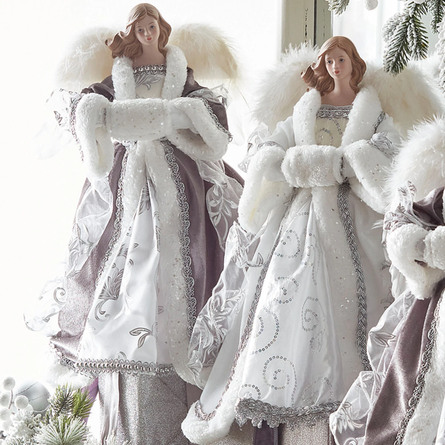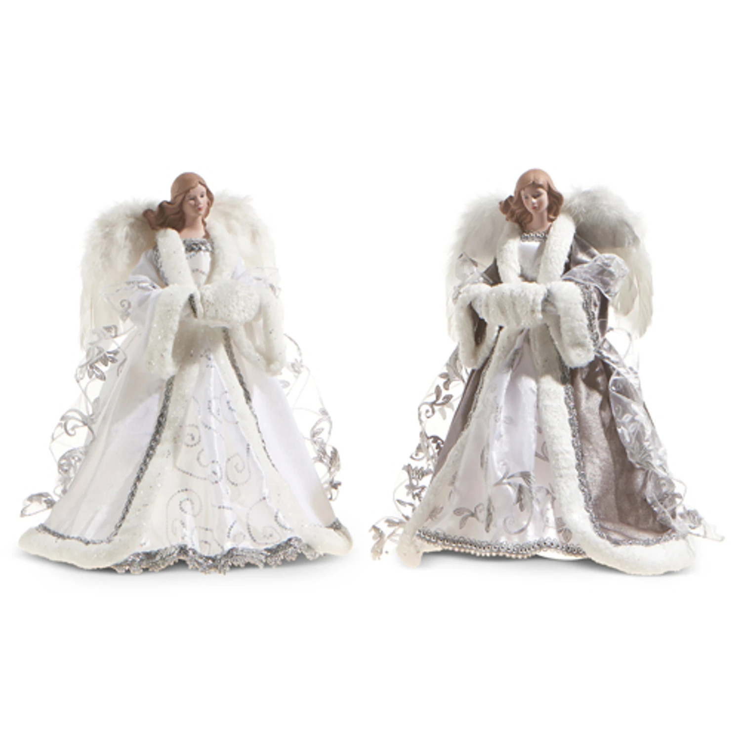 Either of these gorgeous angels are sure to look stunning up on top of your Christmas tree this year! Choose one with a white dress or with the purple dress, each one detailed with silver embroidery and silver glitter, and trimmed with white fur and a pair of feathery wings behind them! Sold individually. Made by Raz Imports. Made of polyester, plastic, and porcelain. Dimensions: 16″. Item #: 4315546Â
