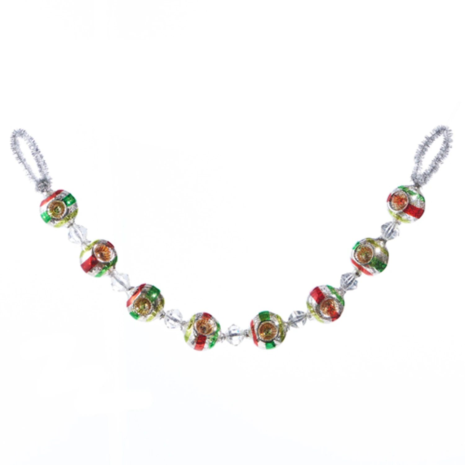 This garland features a silver tinsel string dotted with glass ball ornaments with red and green stripes and small reflectors! Each ball ornaments is spaced out with a faceted crystal bead! Use this to add a lil oomf to your tree, garland, or in a wreath! Made by Raz Imports. Made of glass. Dimensions: 26″. Item #: G4324553