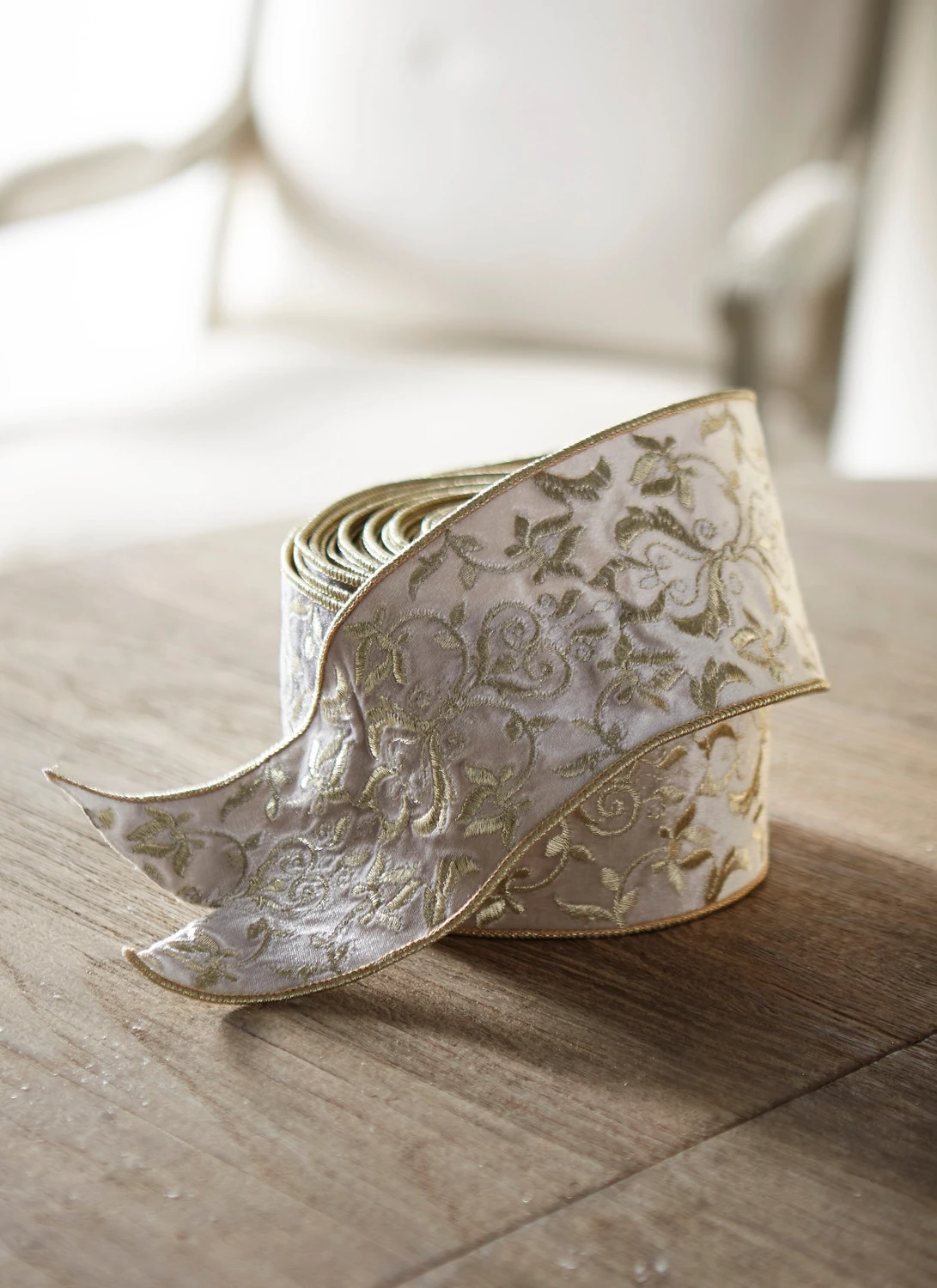 This stunning ribbon features an ivory and champagne patterned embroidered in it with champagne embroidery trim. Made of polyester. Made by Raz Imports. Dimensions: 4″ x 10 yards. Item #: R4371784