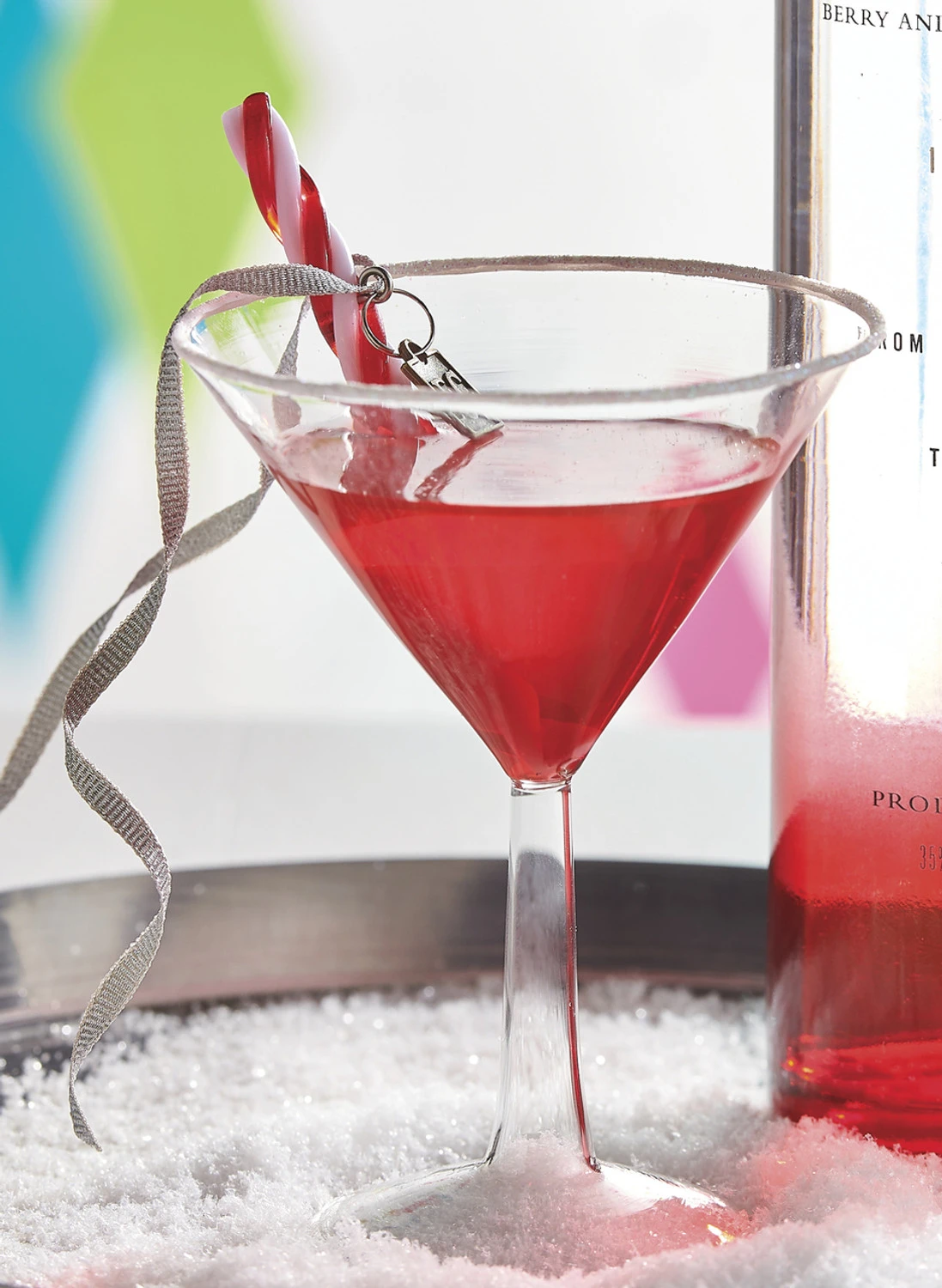 Cheers! Don’t forget to raise a glass and celebrate this holiday season! This ornament features a pretty martini glass filled with a festive red liquid with a white sugar rim and a candy cane stir stick! This would make a great hostess gift of addition to your Christmas tree! Made by Eric Cortina for Raz Imports. Made of glass and resin. Dimensions: 4″ L x 3.5″ W x 5.75″ H. Item #: 3953029