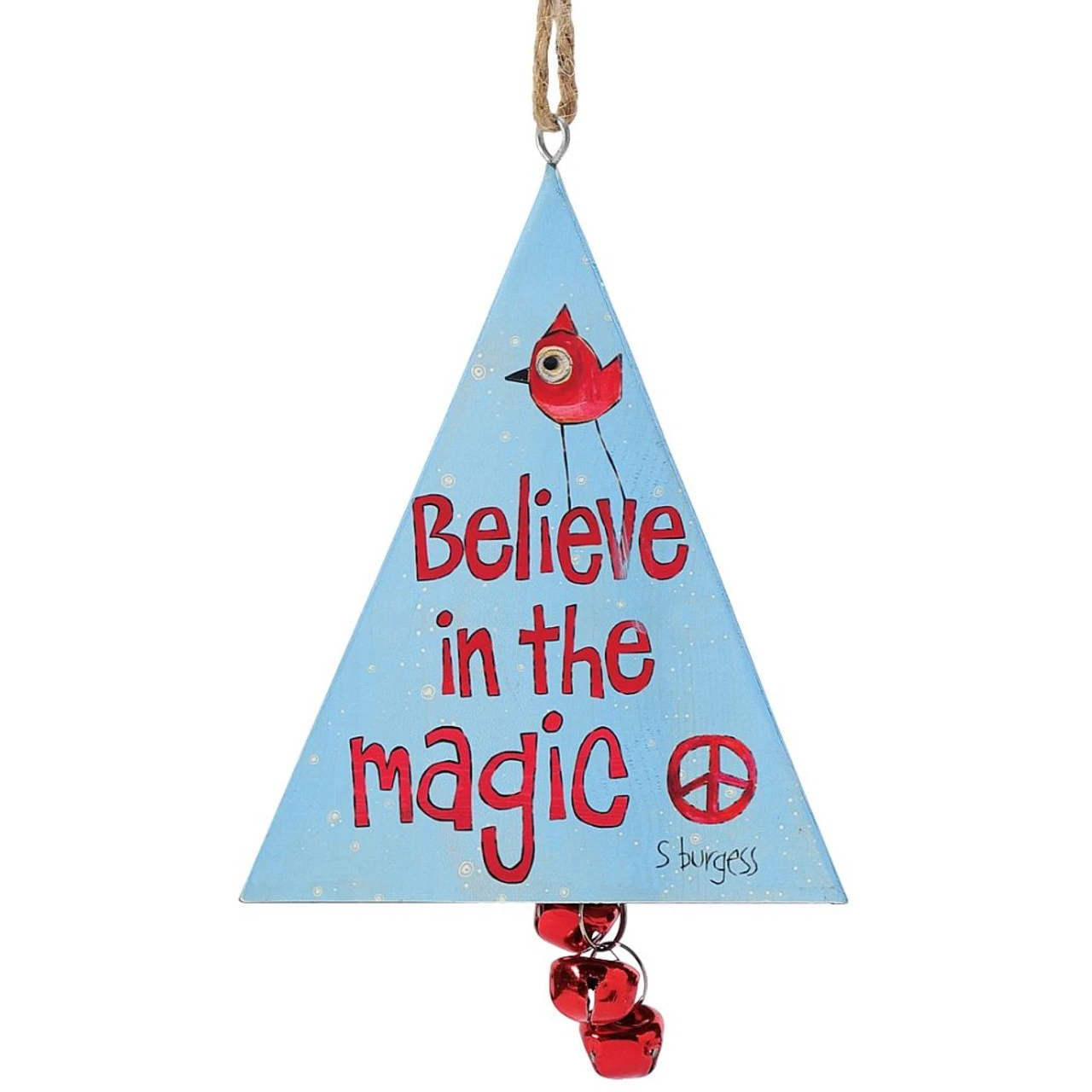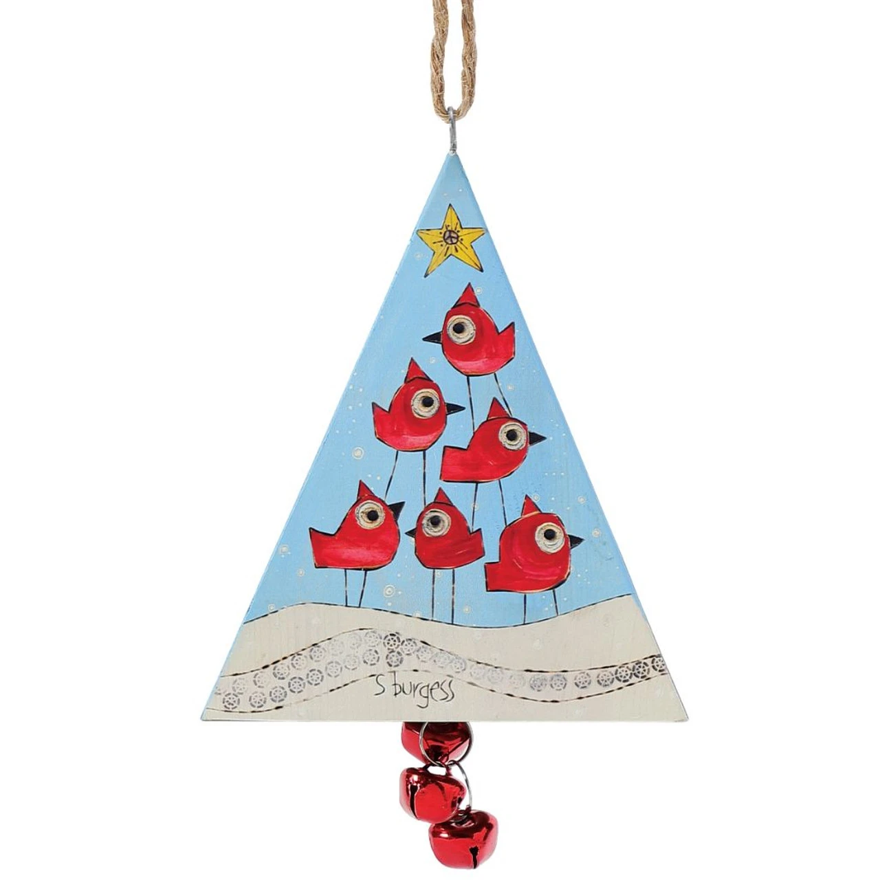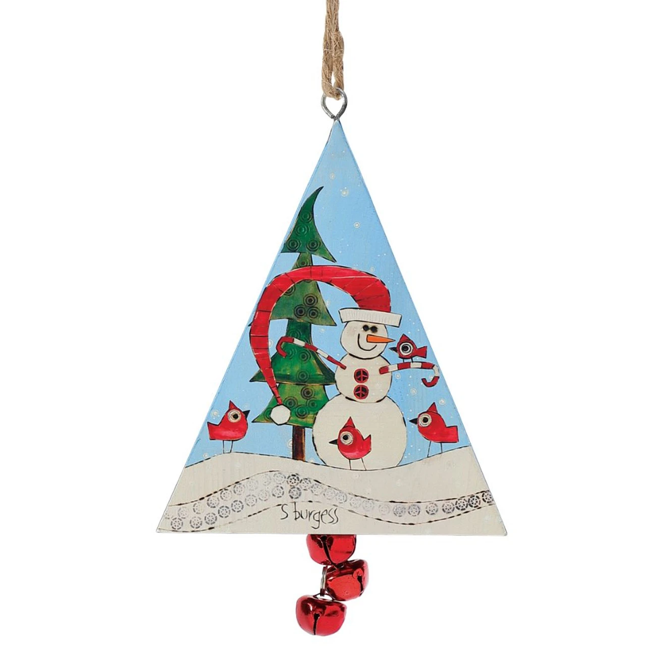 This tin triangle ornament is like having three ornaments in one! Featuring three different hand painted designs this beautiful ornament is a must have.