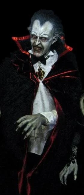 The Count haunted house statue from The Horror Dome will make a freaky and frightening addition to any professional haunted house attraction. Hand crafted, detailed and painted, this semi-posable statue is incredibly lifelike. Standing at 6′ tall, he’s an imposing sight, especially when accenting with motion triggered lights and fog. The Count has a menacing expression, pale grey skin, and blood from a fresh kill dripping off his lips. He wears a white dress shirt and bow tie, under a black cloak with red trim. He’s an iconic vampire design that feels eerily familiar and completely disturbing. Set an unforgettable scene, or attract customers to your business around Halloween, with this fantastically ferocious statue.