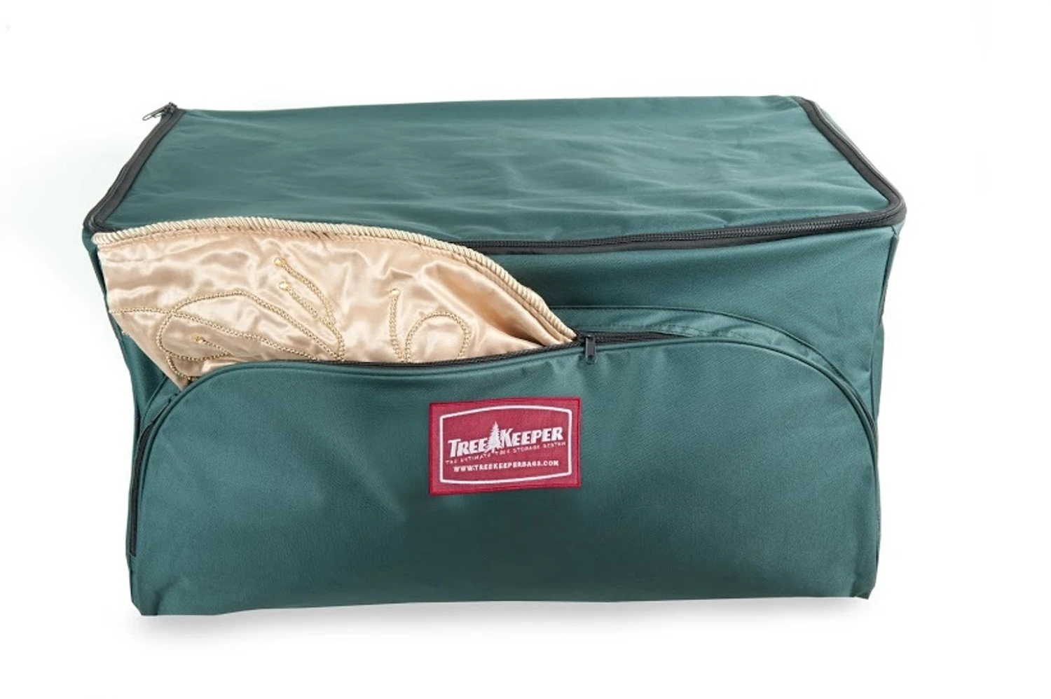 Keep all your precious Christmas ornaments safe and dust free with the Treekeeper 3 Tray Ornament Keeper Storage Bag. Featuring a front pocket for additional storage, this bag has an inner metal self standing frame for support and protection. Three acid free, removable fabric trays hold your ornaments safely and securely. Holds up to 72 4″ ornaments. Made by Treekeeper. Made of acid free fabric, metal, and polyester fabric. Dimensions 27″ x 19″ x 14″. One year warranty. Item # TK-10127.Â